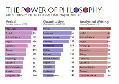 Philosophy majors perform very well on exams for graduate and professional school. Philosophers outscore all other majors on the Graduate Record Exam (GRE’s) and receive scores that are among the highest on the LSAT’s, GMAT’s, and MCAT’s.